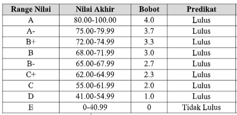 Penilaian dilakukan secara bulat (A, B, C, D, atau E). Jika karena sesuatu hal dosen terlambat atau berhalangan memberikan nilai, maka pada kolom nilai diberi notasi : “T” (berarti tunda). Jika karena sesuatu hal, mahasiswa mengundurkan diri dari mata kuliah padahal kuliah sudah berjalan, maka pada kolom nilai diberi notasi : “M” (berarti mundur/batal kuliah).